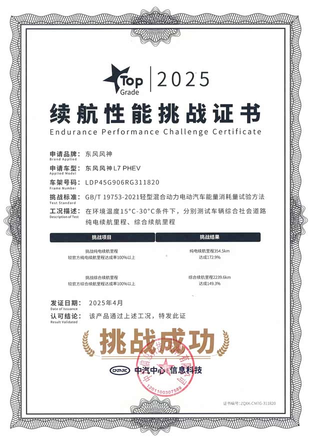 别人拿实验室数据说话,风神L7把中汽中心请到海南,在真实的拥堵、高速、城市道路里,跑出了一组硬核数字:纯电续航354.5km,综合续航2239.6km。这意味着什么?按官方纯电续航205km的标定,纯电续航达成率172.9%,一箱55L的油,绕海南岛三圈半还有富余。说白了,这台车就是冲着“不玩虚的”去的,你日常怎么开,它就怎么测。