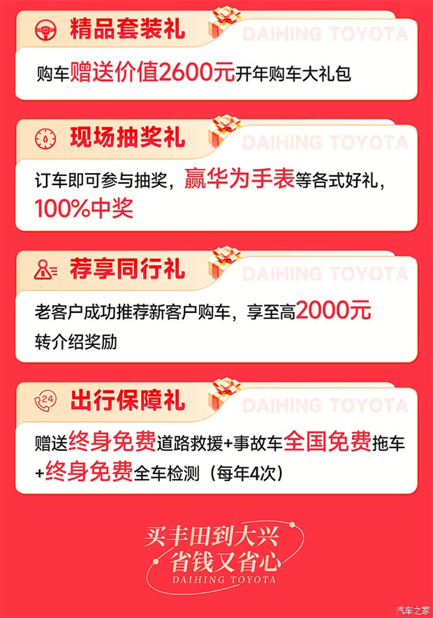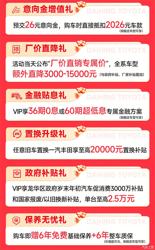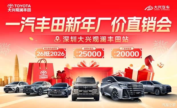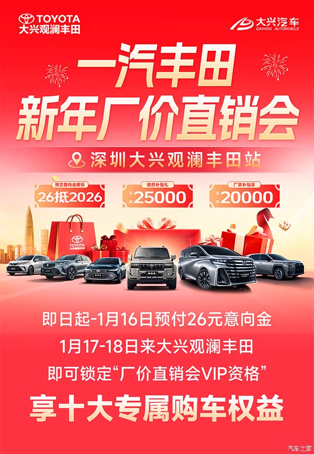 一汽丰田新年厂价直销会——深圳大兴观澜丰田站 ,预付26元意向金,解锁10重专属权益