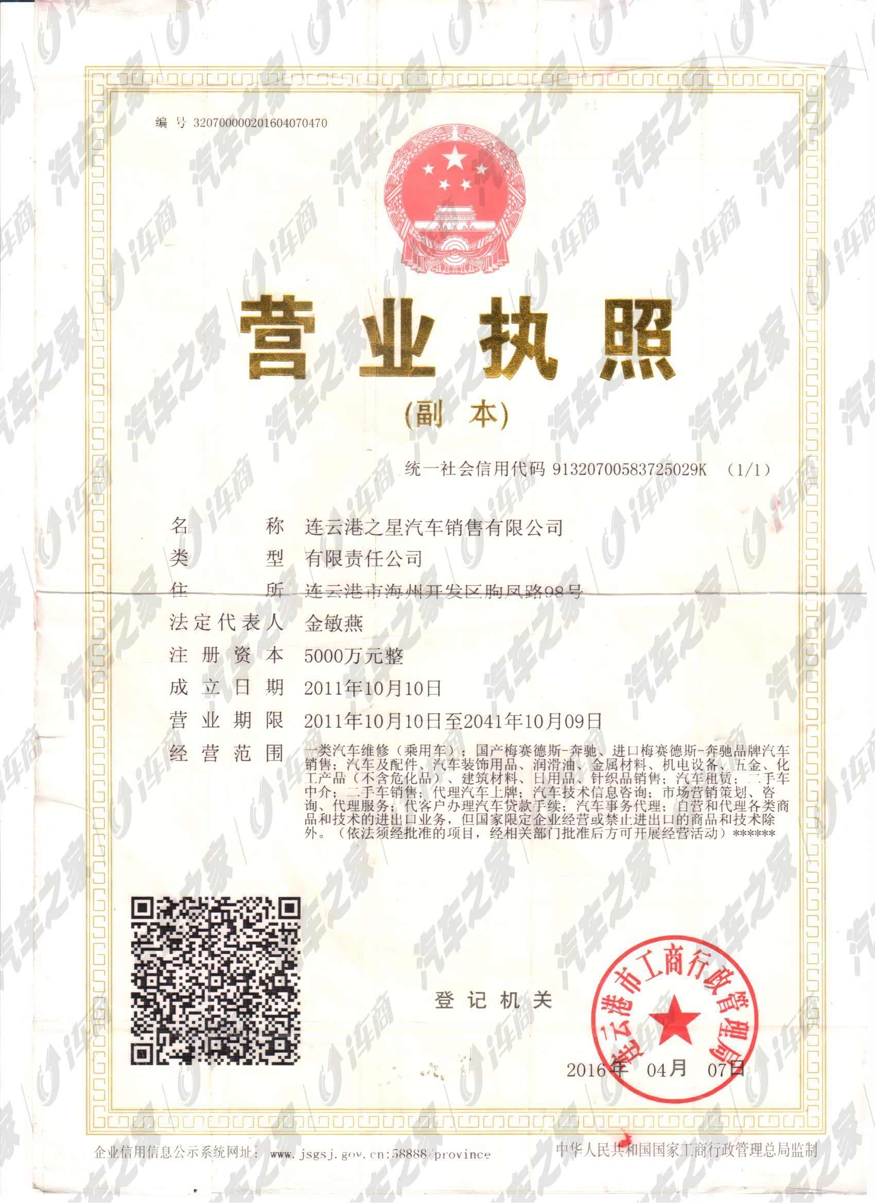 连云港之星汽车销售有限公司是连云港市第一家梅赛德斯-奔驰授权经销商,是集奔驰全系产品销售、服务、维修、零配件多位一体的汽车专营4S店。展厅位于海州开发区胊凤路98号,总投资达1.5亿元人民币,占地22亩,设计造型新颖、功能齐备,完全按照梅赛德斯-奔驰全球统一标准进行建造,严格履行奔驰汽车全球统一标准的高品位、高质量服务,将奔驰的品牌价值和理念传达给每一位客户,实现我们“更高标准,更佳服务”的承诺。地址;海州开发区朐凤路98号