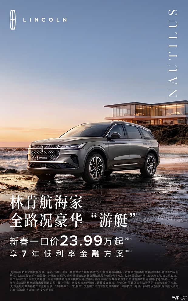 全路况豪华“游艇”,新春一口价23.99万起,享18888元两年至尊关爱延保及7年低利率金融方案,林肯老车主置换、增购享15000元补贴;