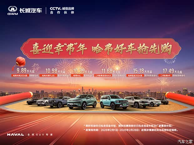 "嘉诚哈弗新耀店,成都城市官方授权店,专业用心是我们的服务宗旨,累计服务超80万车主。哈弗H6上市13年,单品月销超8万、连续5年全球SUV影响力排名TOP10,赢得了400余万国民信赖口碑。哈弗H6换新一口价,25款国潮限时7.19万元起,同时享多重大礼,另享国家和地方补贴政策,性价比超高,欢迎到店赏车!嘉诚哈弗新耀店为您提供专业的一条龙购车服务!