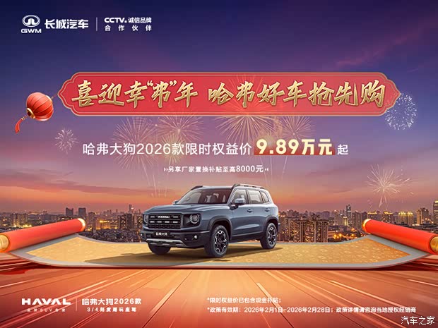 近日,本店内有哈弗大3/4刻度潮玩座驾,哈弗大狗2026款现已焕新上市,潮流方盒子造型更加个性时尚;升级新一代Coffee OS 智能座舱,应用生态更丰富,语音响应更速度;14.6英寸智慧中控屏清晰度更高、操控更流畅;高配车型搭载2.0T+9DCT动力组合,8种驾驶模式,智能电控四驱系统,“2”把锁等配置,越野性能再突破,全场景自由行!现在购车,享限时优惠价9.89万元起,另享厂家置换补贴至高8000元及国补/地补至高15000元等多重壕礼。