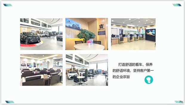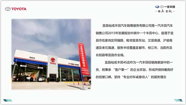 宜昌裕成丰田汽车销售服务有限公司严格按照一汽丰田最新标准设计建成集品牌体验、车型展示、新车销售、售后服务于一体的4S店,可以亲身感受丰田汽车无与伦比的卓越性能,同时本司秉承一汽丰田“专业对车,诚意待人”服务理念,致力于满足客户需求,更以追求用户的全方位身心愉悦未最终的目标,将“客户第一”的核心价值赋予到公司服务的全程。