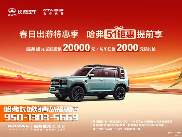 ②金融方案详询当地授权经销商,7年超低息为融资租赁产品,首付金额/月供金额以哈弗猛龙2026款Hi4 105 Pro 官方指导价享受现金优惠后计算;