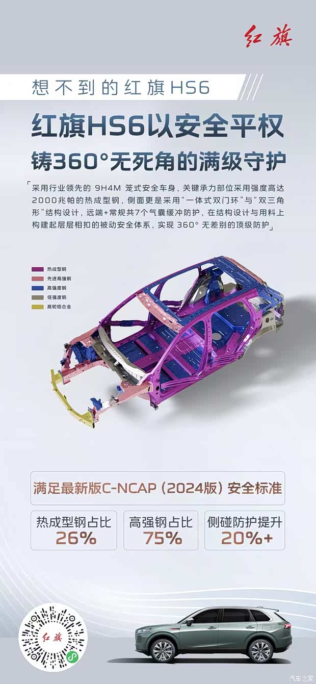 红旗HS6以安心平权铸满级守护,9H4M笼式车身+2000MPa热成型岗+7气囊全方位守护,打造360°无死角的安心相伴