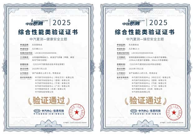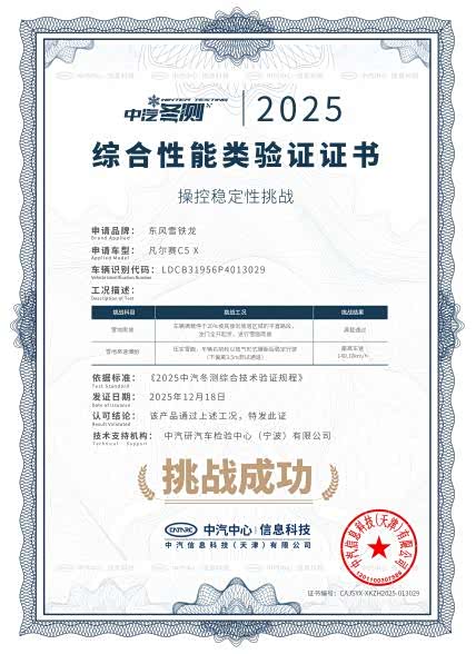 凡尔赛C5 X曾荣获C-NCAP五星安全认证、中国十佳车身、中汽研“驾乘品质之星”等权威背书。2023年5月,凡尔赛C5 X 挑战国内首次高速连环追尾主被动安全联合测试,以12项验证项目全部合格通过的优秀成绩,获得“3A”评价;2025年7月,在2025中汽夏测中通过太阳辐射隔绝能力、高温空气质量及湿滑路面高速爆胎三大测试项目,荣获健康与操控双安全权威验证证书;2025年12月,在中汽中心极寒驾控安全主题技术验证中,以140km/h时速在压实雪面完成前轮爆胎测试,在20%坡度的冰雪路面上满载状态一次登顶成功,获颁“操控稳定性挑战”认证证书。一系列硬核荣誉印证了凡尔赛C5 X经得起推敲的卓越品质。