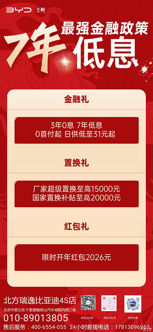 马年开新车,好运一整年 比亚迪王朝网密云北方瑞逸店这波福利太顶了 金融礼:0首付/3年0息/7年低息,日供31元起 置换礼:至高35000元补贴,旧车秒变购车款 红包礼:限时2026元开年红包直接抱走 准车主们快来北方瑞逸把福气和新车一起带回家