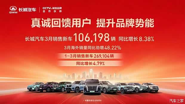 ·长城汽车2026年3月销售新车106,198辆 同比增长8.38%;