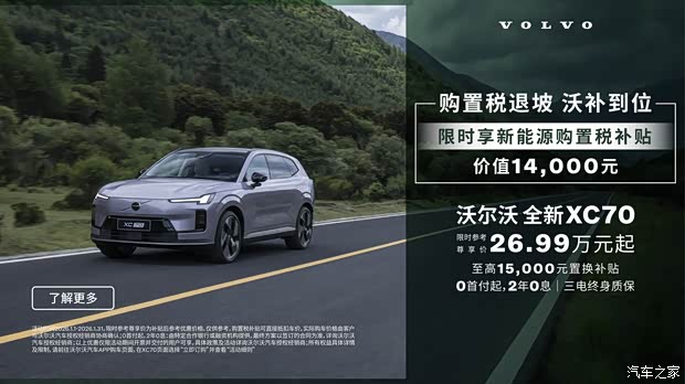 开年福利加码,沃尔沃XC70超值礼遇来袭!全品牌置换至高享15000元补贴,老客户置换再叠4000元专属福利,旧车升级无压力。金融方案灵活适配,至高10万元24期0息,低首付低月供轻松解锁豪华座驾。