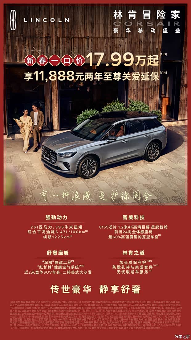 林肯冒险家,合资豪华紧凑型SUV,新春一口价17.99万起,购车享11,888元两年至尊关爱延保,及新春七年超长低利率金融方案。电混车型爆发 261匹强劲动力,一箱油续航1225公里,以8155芯片和1.2米4K高清巨幕打造星舰智舱,享智美科技。
