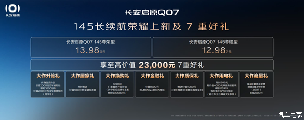 全家人的智能SUV”长安启源Q07荣耀上新,推出长安启源Q07 145尊耀型、长安启源Q07 145尊荣型两款产品,上新价分别为12.98万和13.98万元。长安启源Q07 145尊耀型增加了智能舒享包——49英寸的AR-HUD;长安启源Q07 145尊荣型增加了价值8000元的舒适全家桶,包含前排座椅按摩+主驾座椅后排小桌板+副驾零重力座椅+二排座椅通风加热等配置。已下订145豪华型和145尊贵型车型的用户,长安启源Q07会进行免费升舱,5月31日前(含)下订还可享至高总价值23000元7重好礼。