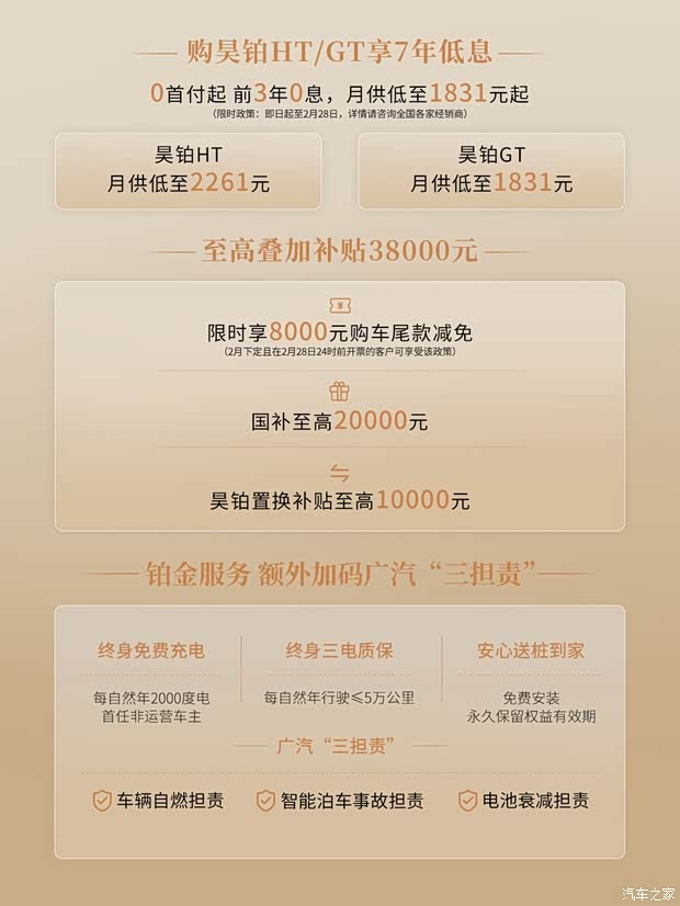选昊铂,即是选择一份长久安心的承诺。作为广汽集团旗下的高端品牌,昊铂提供的“铂金服务”涵盖终身免费充电、终身三电质保及安心送桩到家,从补能便利到售后 ,全程悉心关怀。更有业内领先的“三担责”承诺,针对车辆自燃、智能泊车 、电池衰减超标三大用户核心关切提供 ,极大减轻用车担忧,让用户每一次出行都从容自信。