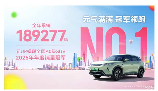 据乘联会乘用车销量数据,准A级潮趣纯电SUV元UP凭借硬核产品力与精准市场定位,以189277辆的销量成绩蝉联2025年A0级SUV年度,成为当之无愧的小型SUV市场。这一亮眼数据充分彰显了其在市场上的强大竞争力和广泛认可度。骄人成绩的背后,是元UP全方位越级实力的支撑,从外观设计到性能配置,每一处都可圈可点。