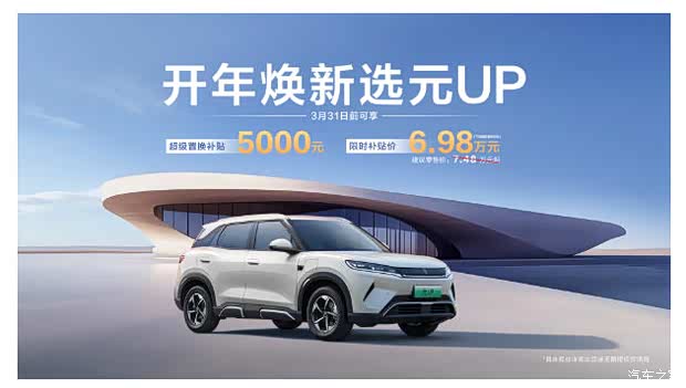 春节刚过,比亚迪王朝网立即打响开年购车福利第一枪,推出“开年福利马上抢”活动。即日起至3月31日,购买元UP即可享受超级置换补贴5000元,补贴后起售价低至6.98万元,真诚无套路,为消费者带来实实在在的购车钜惠。