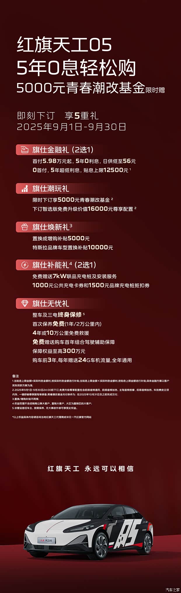 红旗天工05 5年0息轻松购,5000元青春潮改基金限时赠 即刻下订 享5重礼!