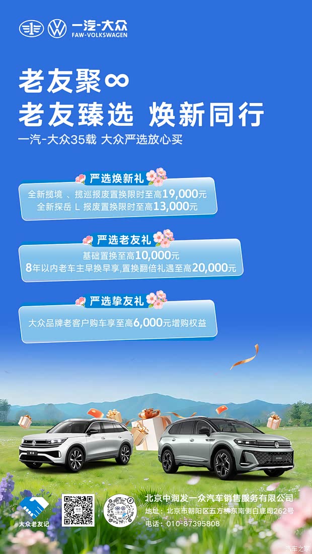 #一汽大众老友聚 [烟花] #老友臻选 焕新同行[庆祝] 老友焕新季 感恩同行[太阳] 以老友之名,赴暖心之约[玫瑰] 线上直播宠粉福利整周不停[烟花] 线下温馨体验,专属关怀到位[庆祝] 全新揽境、揽巡品鉴专场[爱心] 不负相伴,轻松焕新座驾[玫瑰] 活动地址:北京市朝阳区五方桥东南侧白鹿司262号