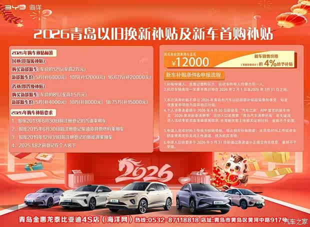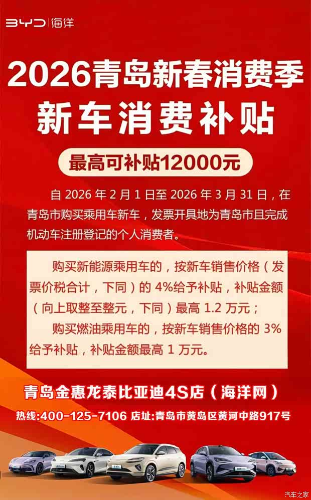 爆竹声渐远,春意已盎然。当元宵的汤圆香遇上女神节的温柔风,比亚迪海洋网青岛金惠君泰4S店携满满诚意而来,为岛城车友送上开年第一波重磅福利!2026年2月25日-3月31日,多重补贴叠加,金融方案灵活,让你轻松把心仪座驾开回家,开启马年新征程!