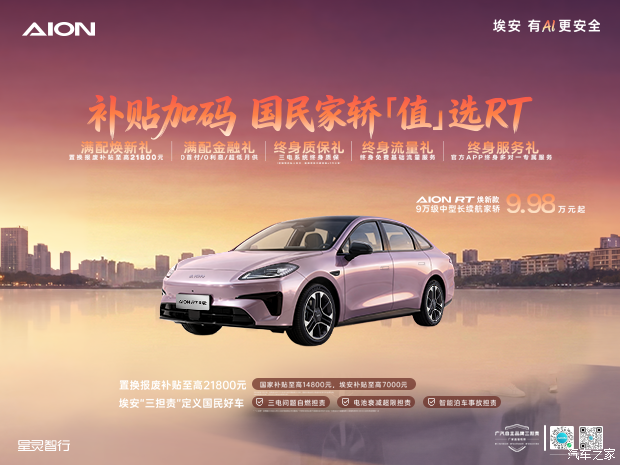 新车提供7种莫兰迪色系车色,车漆采用7道涂层工艺,效果更加细腻,平整透亮。在车内,AION RT拥有软包大空间,用户经常触摸的区域全部采用了软包材质。从座椅来看,新车后排座高达到320mm,臀部角度接近95°,旨在提供更舒适的乘坐体验。同时,座椅设计更贴合人体身形,内部采用双层高密度海绵填充,中层柔软,包裹感强,底层硬度适合,支撑性突出。新车后排头部空间达到940mm,腿部空间达到943mm;前排头部、腿部空间均超过1米。前排座椅还支持一键放倒,营造出“大床房”式宽敞空间。新车后备箱容积为540L,开口尺寸达470mm,便于用户取放后备箱最深处的物品,尾门门槛低至670mm,提放物品更轻松。在智能驾驶方面,AION RT搭载了激光雷达高阶智驾,拥有27个智驾硬件,及第四代感知端到端深度学习大模型、英伟达Orin-X高算力平台。激光雷达可变焦,探测距离更远,感知更快、更精准的硬件优势,令AION RT能够适应城中村、乡村小路等复杂场景,对突然出现的行人、电动车能够作出及时反应,有效避免碰撞。得益于AEP 3.0纯电专属平台,AION RT拥有长续航、快补能的纯电体验。AION RT电池容量达到68度,并应用了碳化硅技术,再加上低风阻、轻量化的设计,使其百公里电耗仅为11.7kWh,续航里程达到650km。此外,AION RT的电芯材料和结构、电解液均经过优化,充电效率更高,快充仅需18分钟即可将电量从30%充至80%。