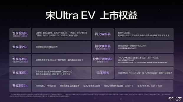 比亚迪王朝正在构建一个从购车、用车、到养车的全链路无忧体系。为此,宋Ultra EV带来了“0元购、0元用、0元养”的超重磅购车权益!同时还有其他丰富权益,为用户带来超值购车体验。