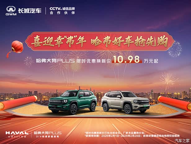 哈弗大狗PLUS PHEV焕新上市,配备第二代Hi4智能四驱电混技术,增配不加价,现在购车可享18000元现金优惠,更有至高8000元置换补贴,另享金融礼、网联礼、质保礼、充能礼多重壕礼: