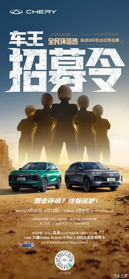即日起,“环塔热”瑞虎8环塔出征预选赛全国招募正式开启。无论你是资深老司机、操控爱好者还是新手小白,只要你也有一颗环塔梦,均可通过奇瑞汽车官方APP、奇瑞汽车小程序活动入口报名参加,也可前往全国奇瑞经销商门店或门店扫码参与,线下咨询还能解锁更多惊喜福利,携亲友同行可享受专场购车权益(最终参赛资格以官方邀约信息为准)。