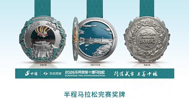 赛道之上,东风奕派不仅全程为跑者保驾护航,更以融入品牌元素的完赛奖牌,定格每一位跑者冲线时的高光时刻。本届完赛奖牌以武当太极圆为造型,采用双层镂空翻盖结构,融合武当金顶、丹江口大坝等核心元素,实现 “一牌藏三景,开合见十堰”,巧妙呈现十堰的山水之美与文化底蕴。其中,全程马拉松与半程马拉松奖牌分别采用金、银配色,极具收藏价值与纪念意义。