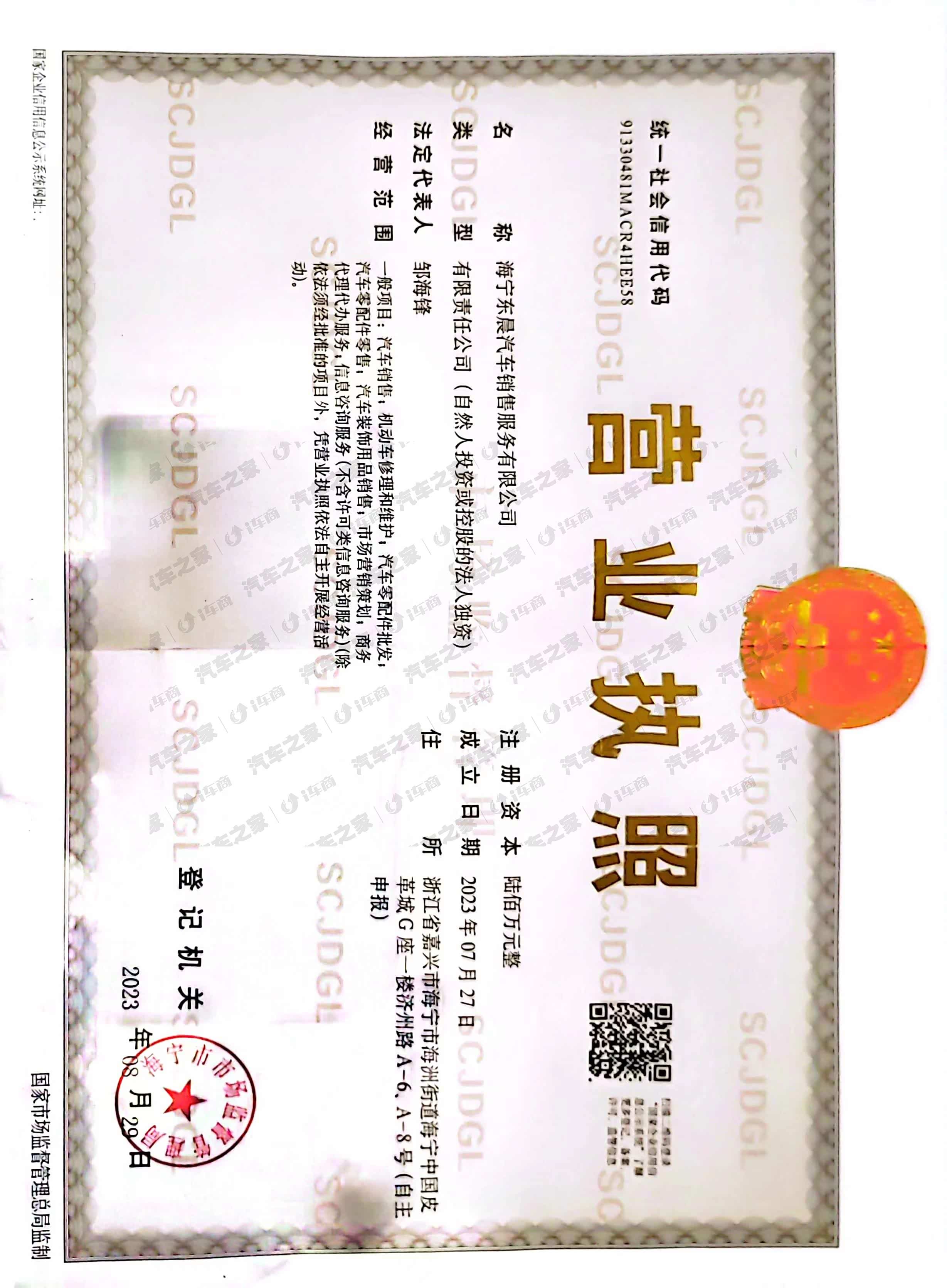 海宁东晨吉利银河汽车销售服务有限公司成立于2023年,
