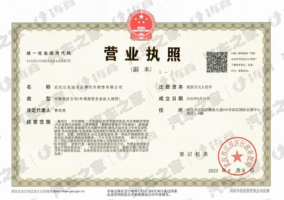 2023年5月20日,位于武汉国际会展中心的比亚迪首家品牌体验中心正式开业。比亚迪武汉品牌体验中心共五层,总面积达6550平方米,包含品牌展示、车型展示、技术展示、用户共创等功能区域。这是比亚迪以打造高级品牌体验中心为目标迈出的重要一步,将为用户创造集探觅科技魅力、体验文化艺术、休闲会友于一体的全新商业景观。 地址:武汉市江汉区解放大道696号武汉国际会展中心西区1-6楼 销售热线:027-59302266