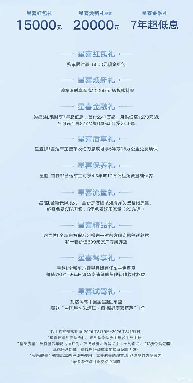 星喜流量礼:星越L全新长风系列、全新东方曜系列终身免费基础流量 终身免费OTA升级,5年免费娱乐流量(20G/月)