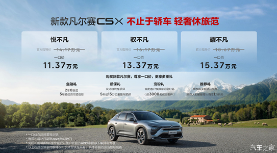 除了新增的配置,新款凡尔赛C5 X上市的最大亮点,莫过于其推行的“一口价”模式。具体来看,新款凡尔赛C5 X共推出三个版型:悦不凡版一口价11.37万元,定位“入门即豪华,优雅实用”;驭不凡版一口价13.37万元,主打“舒适进阶,智能升级”;耀不凡版一口价15.37万元,诠释“旗舰享受,满配体验”。相当于用紧凑级轿车的价格,就能拿下一台合资中型跨界车。