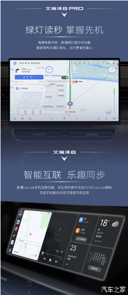 针对不同车型,本次升级还带来专属惊喜:艾瑞泽8 的PRO同步升级高德导航系统,新增绿灯倒计时功能,帮助驾驶员提前预判交通灯变化、合理规划起步节奏,有效节省通勤时间、规避闯红灯风险;艾瑞泽8则新增CarLink手机互联功能,用户在完成配对后可在车机便捷使用手机应用,实现车机与手机无缝联动,让智能互联更具乐趣。