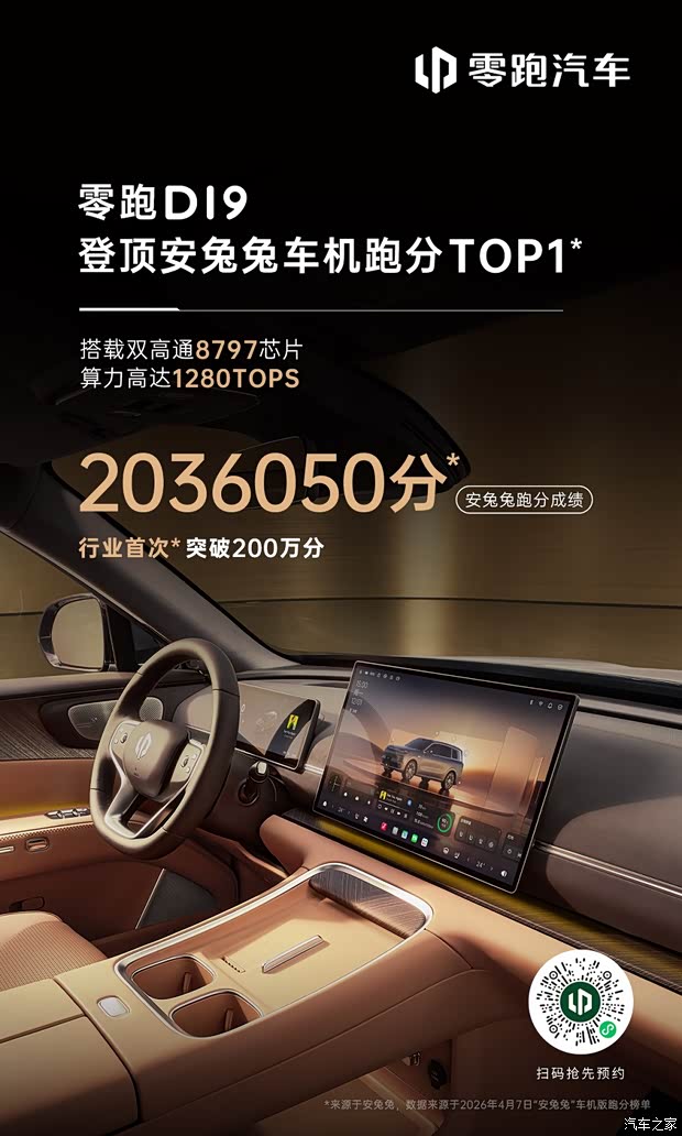 #零跑D19 以2036050分的成绩位列第一 成为行业首次突破200万跑分的车型! 搭载双高通骁龙8797芯片,打造舱驾融合体系,总算力达到1280TOPS,支持端侧AI大模型与五屏交互,给你更智慧、更流畅、更安心的出行体验。 4月16日,零跑D19上市发布会 现999元意向金可享3大盲订权益! ✔️优先排产,加速交付 ✔️优先参与官方活动并尊享专属服务 ✔️创始人签名版D19模型(前2000名订购用户)