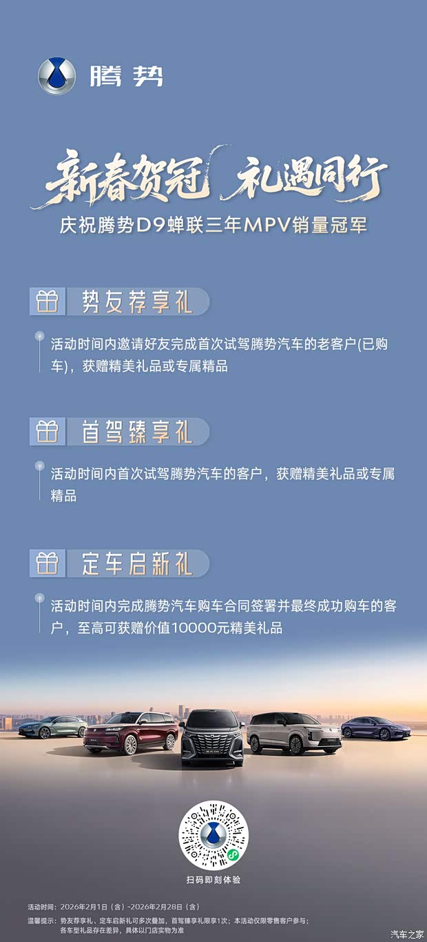 新春购车季火力全开,腾势汽车带着双重王炸福利来了!为庆祝腾势D9蝉联三年MPV首列,品牌推出「新春贺冠 礼遇同行」与「新春腾势 红运当头」双活动,从试驾到订车,全链路惊喜拉满,助你把新年座驾轻松开回家。