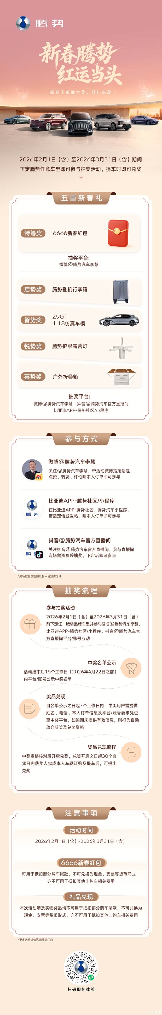 • 特等奖为6666元新春红包(可直接抵扣车款),还有腾势登机箱、Z9GT 1:18仿真车模、护眼露营灯等实用好礼。