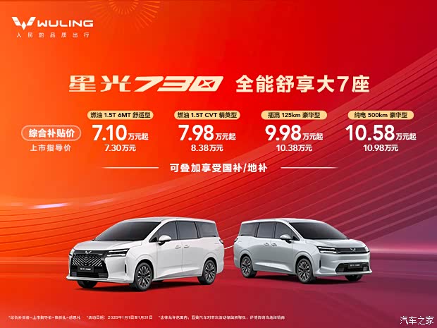 星光730上市即热销!这一次,五菱不仅把车做出来,更把家庭幸福搬上了舞台。综合补贴价7.1万元起,四款车型任你选——燃油1.5T 6MT舒适型、燃油1.5T CVT精英型、插混125km豪华型、纯电500km豪华型,让你轻松入手。星光730上市49天累计销量已突破20000台,于12月再度登顶15万内MPV销量榜首。