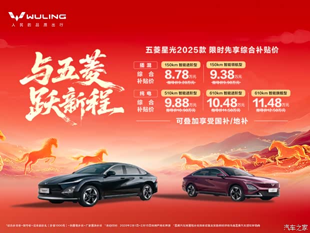 五菱开年礼,购车补贴超给力,其中150km 智能进阶型上市价:9.28万,置换补贴价:8.78万;150km 智能领航型上市价:9.98万,置换补贴价:9.38万。【纯电车型】510km 智能进阶型:10.98万,置换补贴价9.88万;610km 智能进阶型:11.58万,置换补贴价10.48万;610km 智能旗舰型:12.58万,置换补贴价11.48万。购车更可叠加享受国补/地补。现1000元下订,立享「八重星光豪礼」。