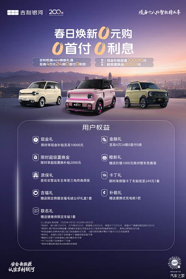 🚙 吉利熊猫mini·萌趣纯电小车迷你车身,超大快乐!城市通勤、周末探店、露营撒野… 灵活好开又吸睛,60万用户的心动之选~ 现在下单,把“0首付0利息+万元级福利”一起打包,开启你的春日焕新出行~