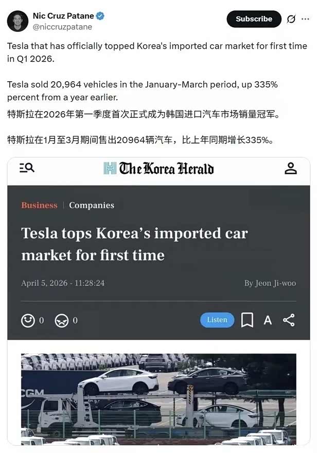 📊销量数据:上海超级工厂3月交付超8.56万辆,环比涨46%,一季度交付21.3万辆、同比增23.5%;韩国一季度销量暴涨335%,首登进口车市场销量榜首,欧洲多国也迎来数倍增长。
