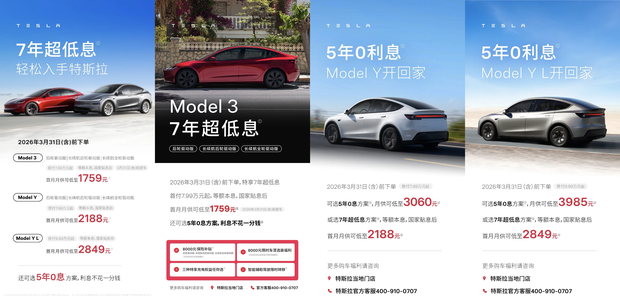 🚗车型方案:Model 3/Model Y首付7.99万起,7年低息月供1759/2188元起,可选5年0息;Model Y L首付9.99万起,7年低息月供2849元起,也享5年0息。