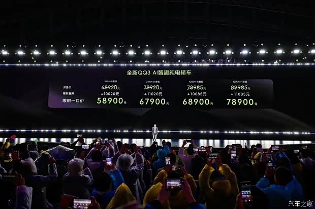 此次全新QQ3共推出420km分享版、420km热爱版、310km分享版、310km热爱版四款车型,限时上市价5.89万元起。新车以六大同级领先(颜值同级领先、空间同级领先、驾乘同级领先、安全同级领先、智趣同级领先、品质同级领先),彻底颠覆了“小车=将就”的传统认知。