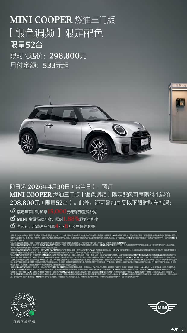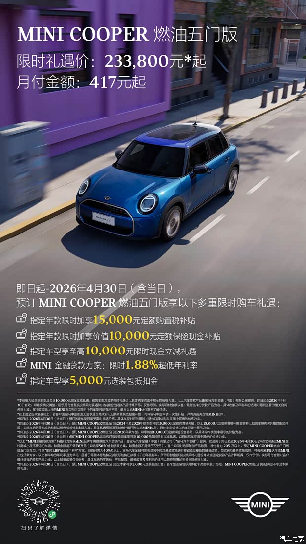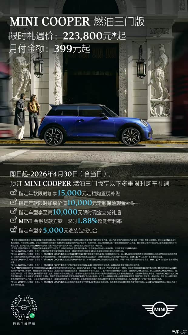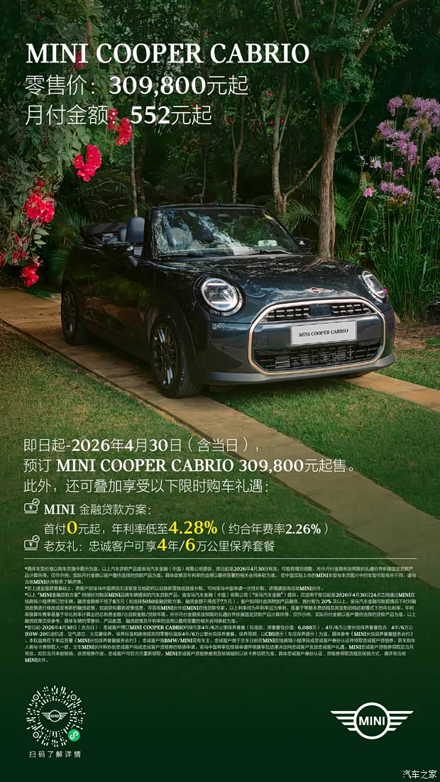 四月春意正浓,正是入手MINI的最佳时机!。即日起预订,您不仅能享受到极具竞争力的限时礼遇价,更能叠加多重购车权益:包括高额的置换补贴、金融贴息方案以及老客户专属保养礼遇。