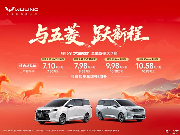 全能舒享大7座」星光730正式上市,一门开万家,为千万中国家庭开启万种幸福可能。新车共推出四款车型配置:燃油1.5T 6MT舒适型、燃油1.5T CVT精英型、插混125km豪华型、纯电500km豪华型,上市指导价分别为7.30万元、8.38万元、10.38万元、10.98万元,更有置换补贴价7.10万元-10.58万元起。