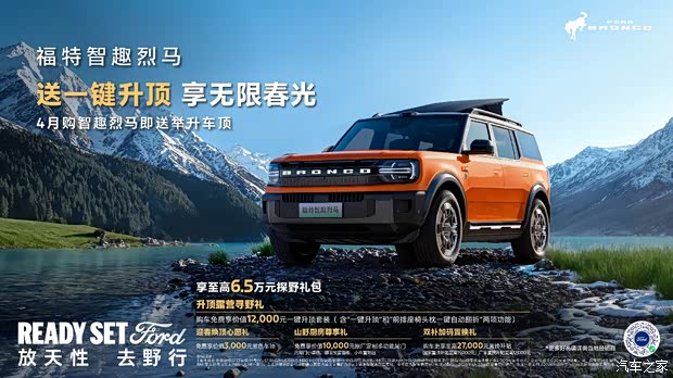 自上市以来,福特智趣烈马以“可城、可玩、可野”的全场景出行能力,满足了用户日常城市用车、户外露营与轻度越野等多元生活需求。春日来临,福特智趣烈马携重磅 “升顶露营寻野礼“再次出发,购车即送价值12000元举升车顶”,综合礼遇至高价值6.5万,带你尽揽春光尽兴野!
